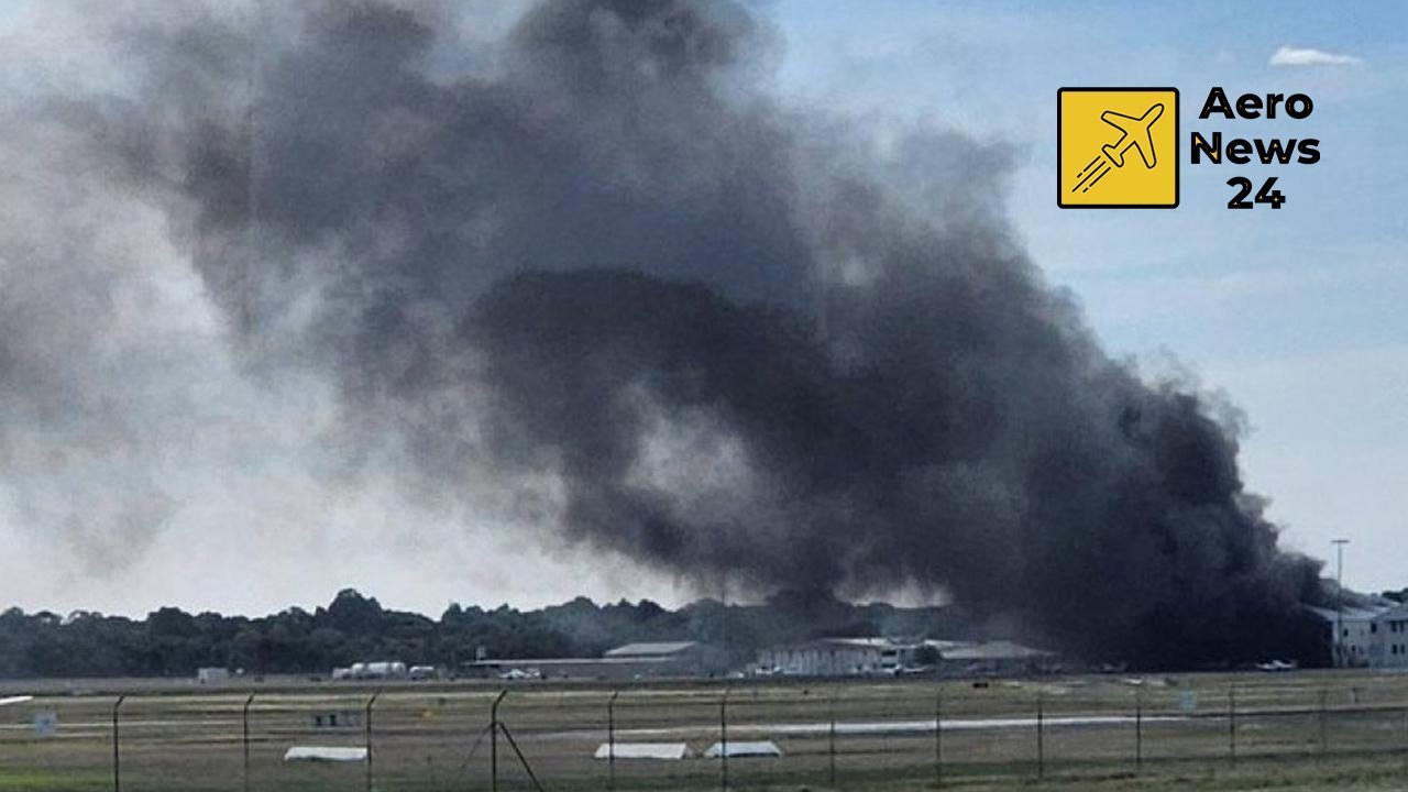 Çarpmanın ardından hangarda büyük bir yangın çıktı ve bölgeden yoğun siyah dumanlar yükseldi.